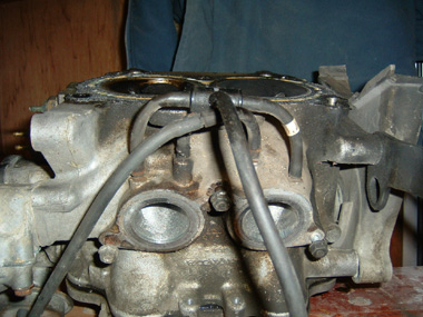 その1 インテーク側から負圧取出しの様子 このゴムパイプがキャブのところに入るのだが なんだか良く意味がわかりません。 ゴムパイプの付け根は真鍮らしき材質のパイプが埋め込まれ 接着剤状のもので固めてありましたが、洗ったらはがれました。 パイプは慎重を期して新品交換といきたいところです。 |