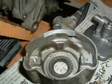 その2 ポイントカバーです。この車はタコメーター無しなので、ただの プラスティックカバーです で純正のタコメーターを取り付けるためには「スペシャルボルト」 とタコメーター用のポイントカバーが必要になります。 |