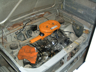 | ←その1 エンジンを積み込み ま〜これは前回と同じ写真ですが 2006年5月にエンジンの積み込みが終了した。オイルをいれ冷却水をいれ各部を点検 とりあえずプラグ穴からオイルを垂らし、プラグコードをはずした状態でクランキング、特にに問題なく「キュン、キュン」と回る・・・・とりあえず一安心 で今度はプラグコードを付けていざ本番、ちょっとぐずったがこれもあっけなくエンジンがかかる。恐る恐る少し回転をあげてみる ブブブ・・・ブオン ブブブ・・・ブオン なんかひっかりながら回転が上がる感じ ま〜タペット調整と点火時期もいい加減だしこんなものかと思いつつ点火時期の調整をする・・なんか変どうやっても調整できない、ある程度回転をあげるといい感じでも・・よくわからん 変な状態のままエンジン回して壊れたら何にもならないので ひとまずエンジンはかかったのだから良しとして先へ進む事にする 予定ではエンジンかかったらさぞ感動するだろうと思っていたがそれほどでもなかったな〜笑 |