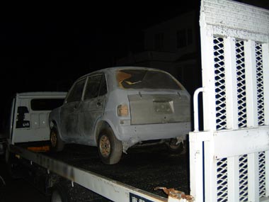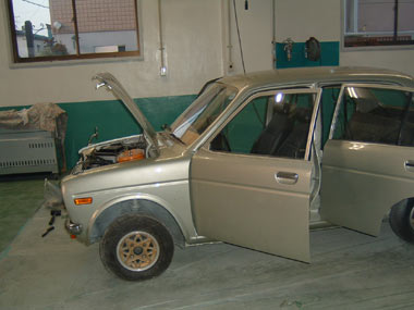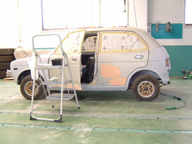 ←その3 はい出来ました〜 だいぶ形になってきた 塗装するにはスペース的に狭いためいつもの整備工場に電話 「すいません、おおよそライフが出来たんで塗装お願いします。えっとペーパーは全体にかけてあります。それとエンジンも積んだので最後の微調整お願いします」 (アイドリングが安定しないとか余計な事は言わず、ここは微調整という表現を使う) 「塗装、そんなの自分でやれよ・・うちは忙しいから出来ないぞ」・・・と こう言うと思ったので 「いや、本当はここまで来たら最後まで自分でやりたいのですが車庫の横幅がなく無理なんですよ〜お願いします。それと・・搬送車でお願いします」 「うん。しかたないな〜、このところ、ちょっと詰まってるからまた連絡するわ」と・・・ま〜あまりしつこくいうと怒られるので、この辺にしておく、(別にただでやってくれと言っているわけではないのだが・・ま〜すぐには払えないけど 笑) |