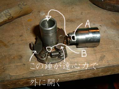 ガバナーの野郎に翻弄されるその1 フルトラの装着が終わり点火時期をあわせた ところが一旦回転を上げて進角するとその後は元に戻らなくなる現象に悩まされた。何度もデスビー付近をばらしては組みなおし 仕組みとしては写真のように 錘(ガバナーウエイト)が遠心力で外へ開く Aの切り欠きとBの出っ張りがかみ合っているので ガバナーの動きに合わせAの部品の角度がかわり ポイントの開閉時期変えるというものなのだが 何度やったろうか。 ヘッドがおりている状態だと、どうって事はないのだが 車に積んだ状態ではヘッドの横向きに付いており 細かいビスが付いているのでとてもやりにくい。 点火時期をあわせるために何度も何度も繰り返す |