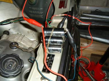 更なる進化を求めて 点火コイルの前に 電解コンデンサーを追加 「○○イナズマ」とか言う名称で販売されているが考え方としてはコンデンサーは電気をためることができるので回路に並列に入れる事によりバッテリーの容量を増やしたような効果が「理論上」期待できるということだと思う。カーオーディオのアンプような電流変動の激しいものには効果があると思う。がコイルに対してはどうか??コイルの仕組みは2個のコイルの片方に電流を流しその電流を止めるともう片方のコイルに高電圧が発生しプラグがスパークするという事なのでオーディオアンプなどとはちょっと性質の異なるものであるが、安定した電圧をコイルに加えるという意味では効果があるのでは・・という期待をもってジャンク箱から適当なコンデンサーをつなげてみた、測定用のタコメーターの針は安定する・・なんとなく良いような感じ |