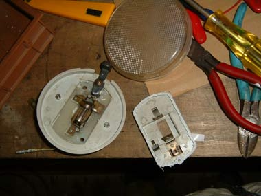 さて〜 車検取得後 ガスケット抜けで少々気落ちした時期もあったのだがこうして完成してみると(まあ もう少し走らせてみないとわかりませんが) やっぱりあきらめなくてよかったと思う。 あそこであきらめたら今までの作業は何になる・・ という後悔の念が残ってしまう。 でかねてより気になっていたルームランプを直す ビビオという軽のルームランプをヤフオクで発見 なんとなく形状があいそうなので購入 真ん中の出っ張りを切り取って、ライフのルームランプの 土台にビス止め、スイッチをライフの接点に合うよう パテで肉盛して鉄板を貼り付け完成〜 テストで電源につなぐと成功! |