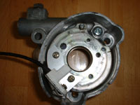 | 1 アルミLアングルの端材をフルトラセンサーのパーツが付くように加工しさらにポイント等が付くプレートにネジを切る | 2 取り付けの状態、バキューム進角でこのプレートは動くのでセンサーから伸びているコードとの干渉を避けるためデスビーのボディを若干加工しています | 3 センサーのもうひとつの部品の加工のため鉄の丸棒をポイントのヒールを押し上げるカム状のパーツの外周にあわせ削る | ||
