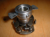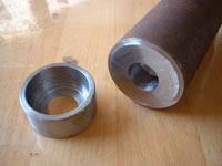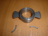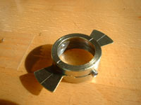 | 4 できた部品を丸棒から切り落とし、センターに溝を切る。写真は装着時と逆向きですが天地の位置関係がずれないように片方が(写真では下)つば状に出っ張っています | 5 本来はリング状のものに180°方向に羽が付いている部品を切り離し、羽だけの状態にする。作成中電話で打ち合わせの際に、説明しやすいように友人とこのパーツの名前を「ちょうちょ」と命名した | 6 先の「ちょうちょ」を4の部品に差込溶接する | ||